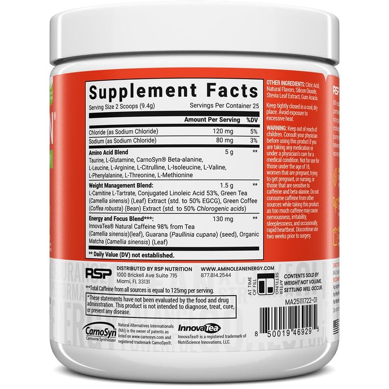 AminoLean is the ideal pre workout, weight management, and amino energy solution for those looking for a great pre workout powder or any time energy solution that delivers real results. Using select ingredients from natural, healthy sources such as Green Tea Extract and Green Coffee Bean, AminoLean features an energy blend that can provide a boost of sustained clean energy and enhanced mental focus preworkout or any time of the day. By blending the recovery power of vegan BCAAs and EAAs with the natural weight management benefits of CLA and L-Carnitine, AminoLean can also help you support lean muscle, manage your weight within an exercise program, and recover faster. Enjoy extraordinary versatility with AminoLean by customizing your serving size from 2 scoops up to 6 scoops to cater to your specific energy needs. Use it as a pre workout powder, afternoon pick-me-up, or a replacement for your morning coffee; without any of the unwanted jitters. AminoLean mixes easily and comes in a variety of delicious flavors. Best of all, AminoLean contains zero carbs, zero sugars, and is vegan friendly, making it a true clean all-in-one preworkout powder, weight management, and amino energy supplement for all active individuals.