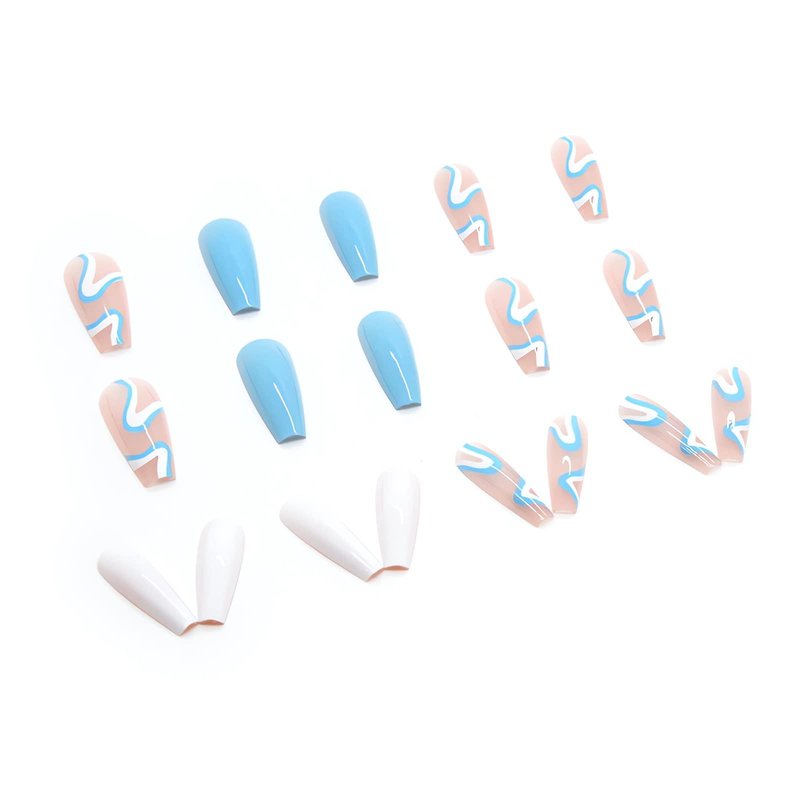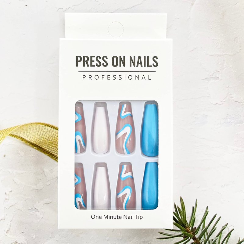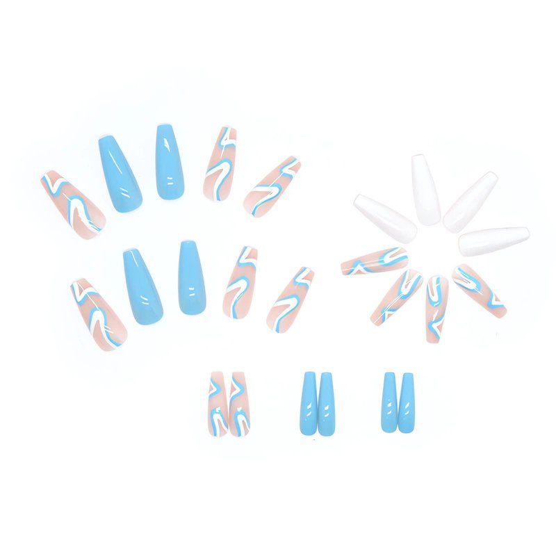 • šŸ’…ć€Package Contains怑you will get 24 pieces French coffin nails with Blue designs,1 piece nail file, 24 pieces nail jelly stickers and 1 piece wooden stick for removing coffin nails tips. No need to buy other things, you can get the nail salon-like effect.