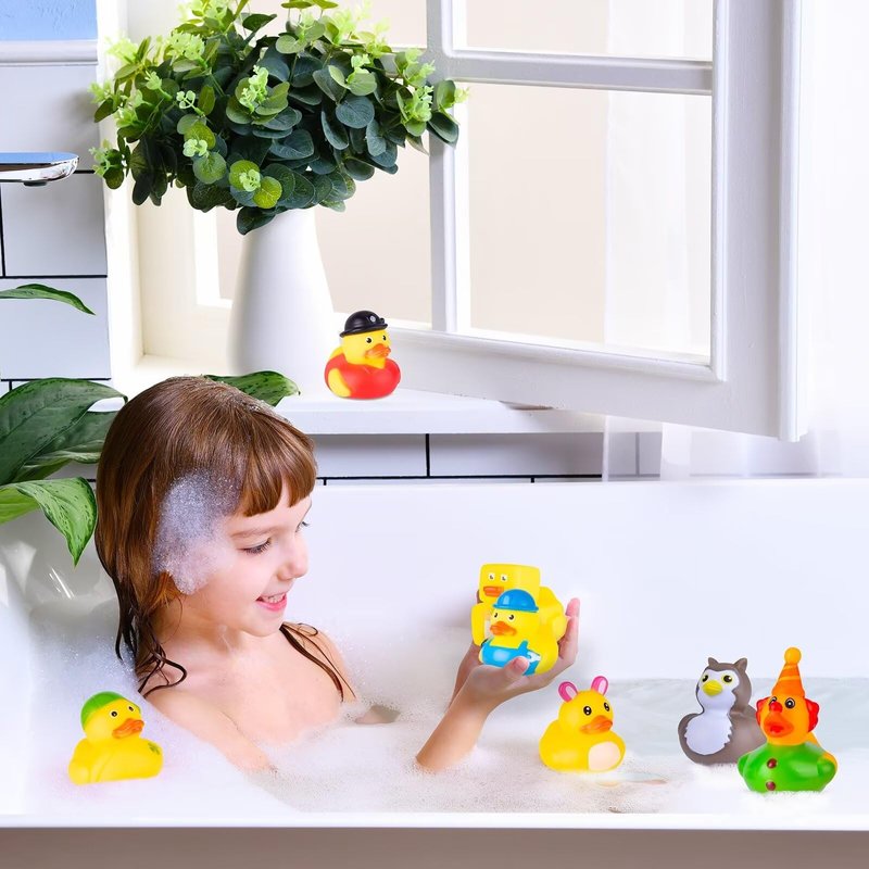 - 【Fun Assortment Rubber Ducks】The bulk rubber ducks with mesh carry bag, designed in various styles for kids toddlers babys adorable party in summer favor set. A fun assortment of mini rubber duckies for kids' bath time, showers, or playtime.