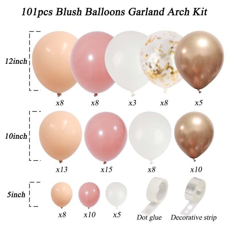 - Blush Balloons Garland Kit: 5in (Nude color 8pcs + Retro pink 10pcs + White 5pcs), 10in (Nude color 13pcs + Retro pink 15pcs + White 8pcs + Gold 10pcs), 12in (Nude color 8pcs + Retro pink 8pcs + White 3pcs + Gold 5pcs + Gold confetti 8pcs). 1pcs 100 glue points and 1pcs balloon arch strip. The rich kit will create a memorable party for you.