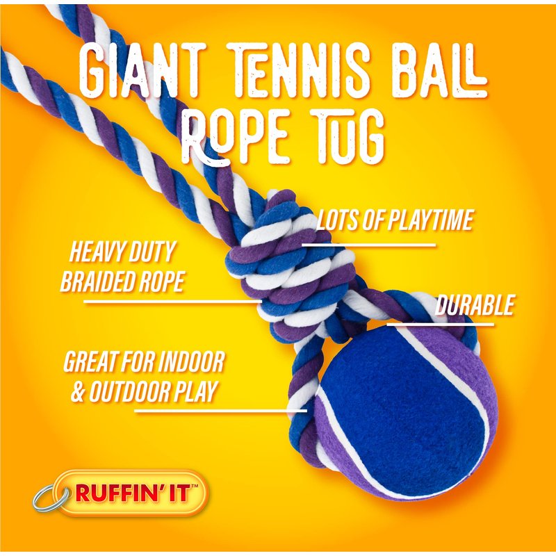 Your game of tug or round of fetch just got even better with the Ruffin' It Tennis Ball Rope toy!This two-in-one toy features a heavy duty braided rope and oversized tennis ball that’s sure to entertain your pup. The perfect toy for all of their favorite ways to play, your pooch will have hours of long-lasting fun! Show your dog some special love this holiday season, give them the gift of play!Show your dog some special love this holiday season, give them the gift of play!