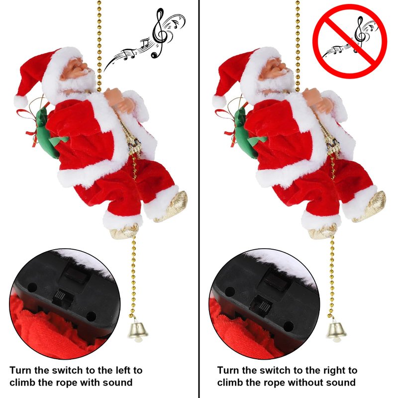 - [Features]: Unique adorable Climbing Santa, exquisite facial expression with a mini green burden on his back, climbing up a bead rope ladder repeatedly with music. He is going to hang wonderful gifts on the Christmas tree or deliver to the kids looking forward