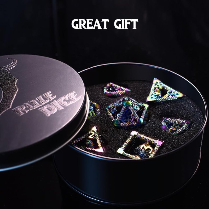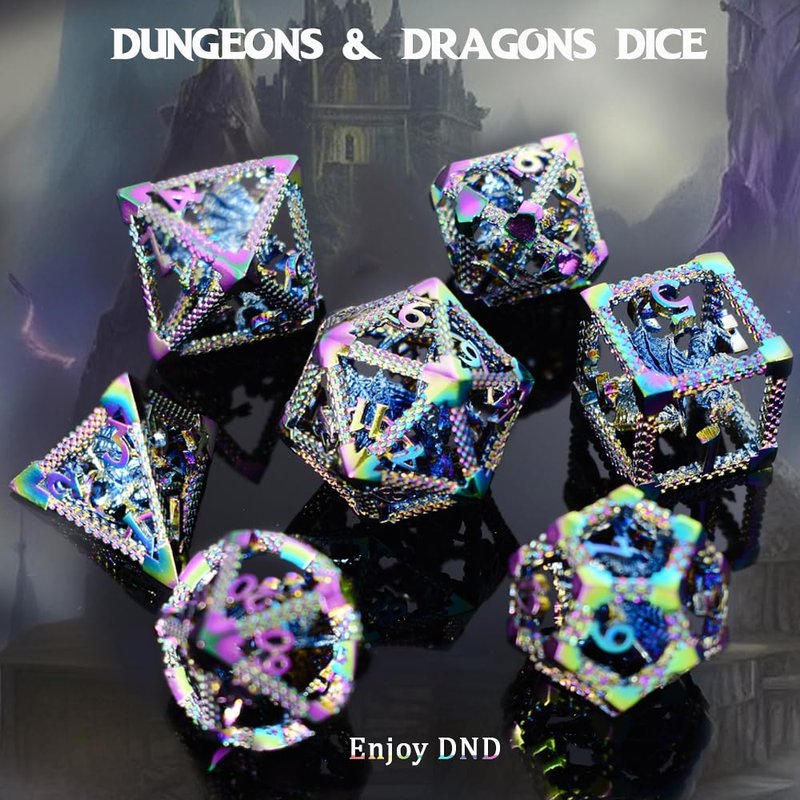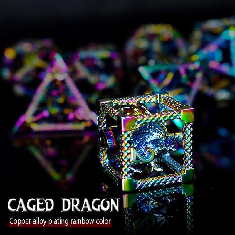 RULE DICE 7pcs Captive Magic Dragon Metal D& D Dice Set, Unique Design, Fantastical Hollow Polyhedral DND Metal Dice, Suitable for Role Playing Games Dungeons and Dragons D&D Dice Set (Rainbow)