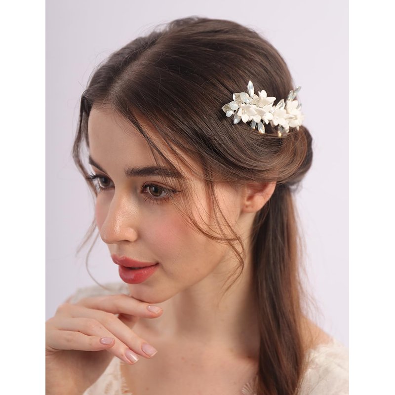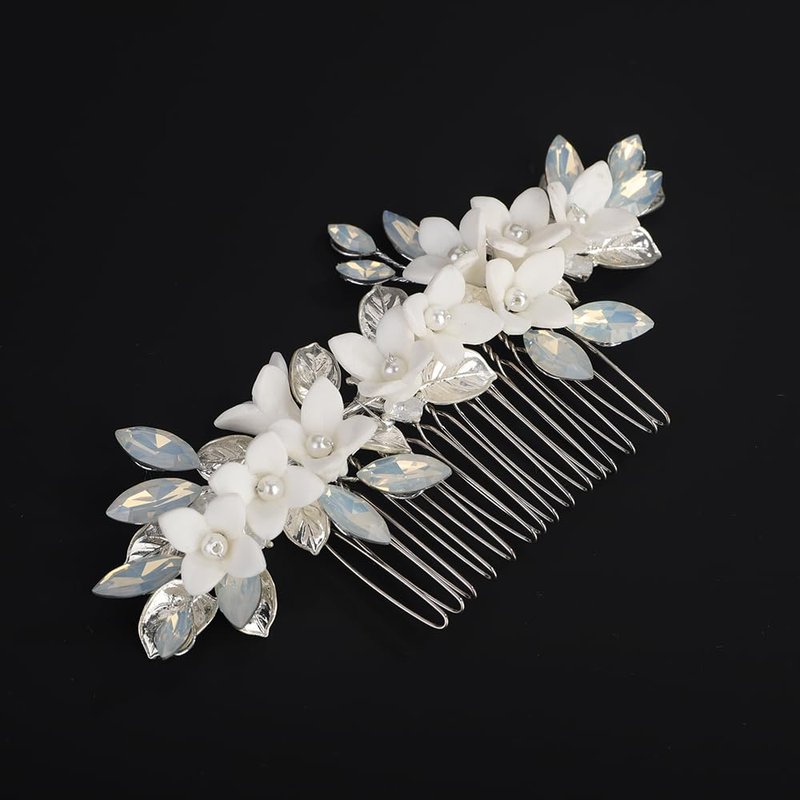 Rumtock Opal Crystal Beads Silver Leaf White Flower Hair Comb Side Headpiece for Wedding Brides Women Banquet Jewelry
