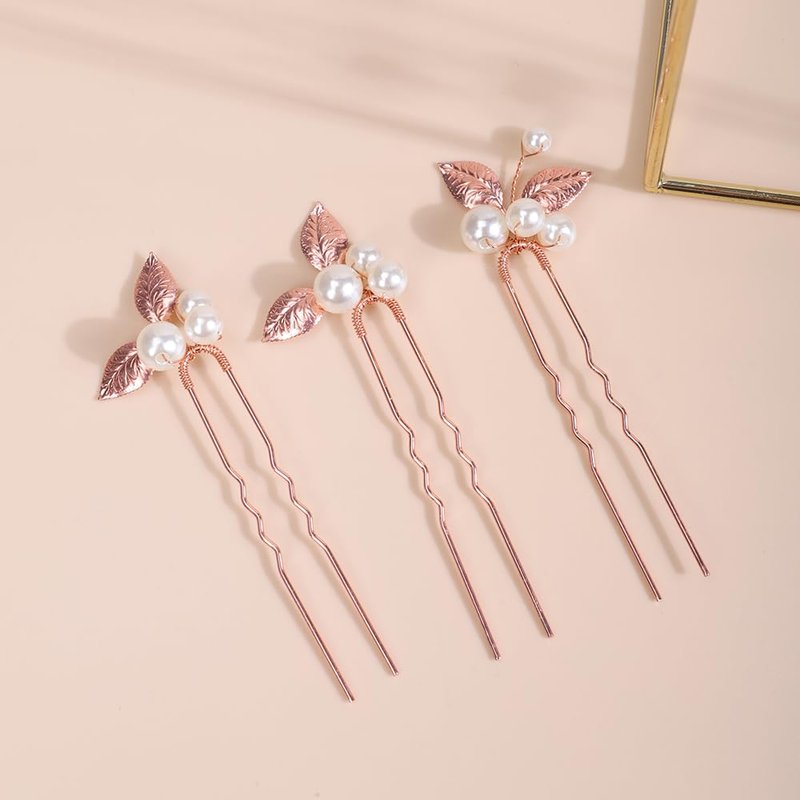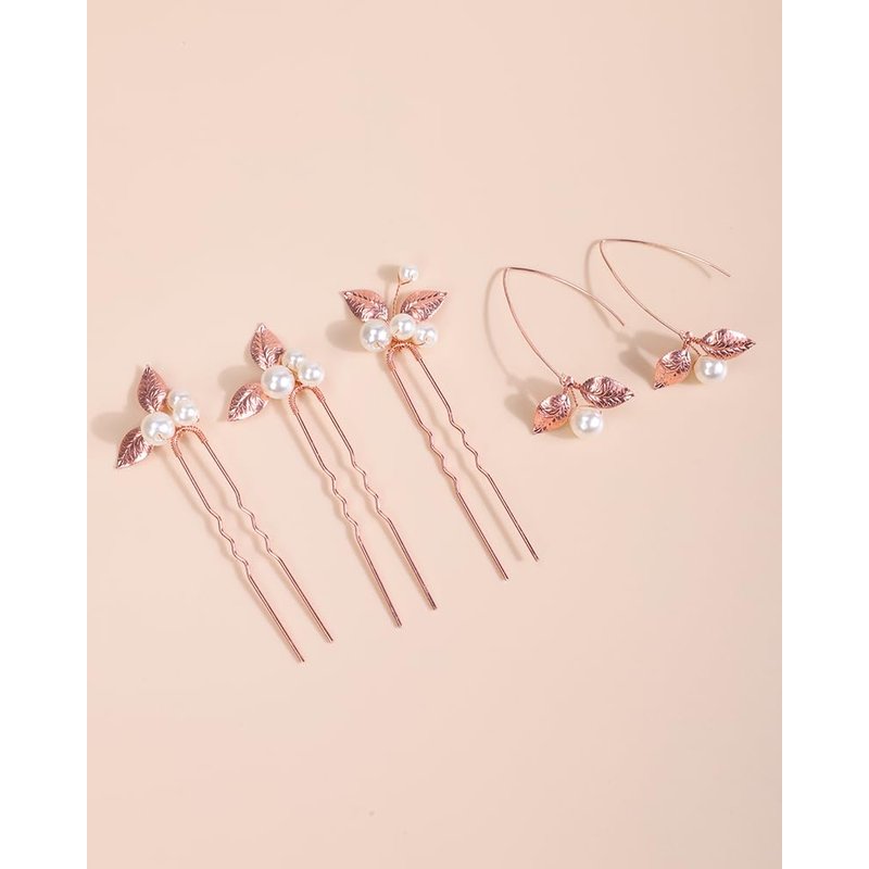 Rumtock Pearl Hair Pins with Rose Gold Leaf Earrings Handmade Hair Piece Jewelry Set for Wedding Brides Hair Accessories (Rose Gold)