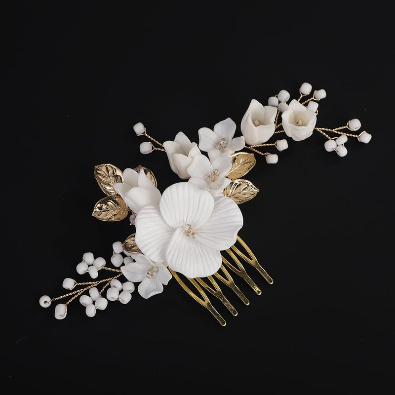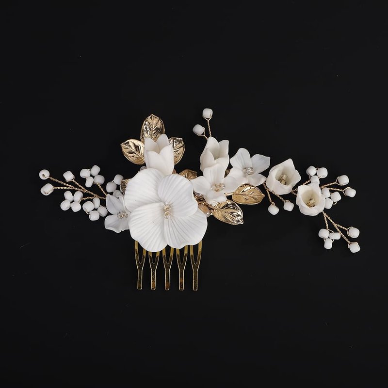 Rumtock Silver Leaf White Flower Hair Comb Women Banquet Wedding Hair Accessories Beads Handmade Jewelry (Gold)