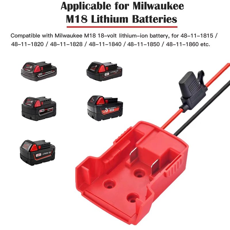 Battery adapter Compatible with Milwaukee M18 18-volt Li-ion batteries (48-11-1815 / 48-11-1820 / 48-11-1828 / 48-11-1840 / 48-11-1850 / 48-11-1860, etc.) Our power converter is well-made, snug fit your battery, install and lock your battery easily.