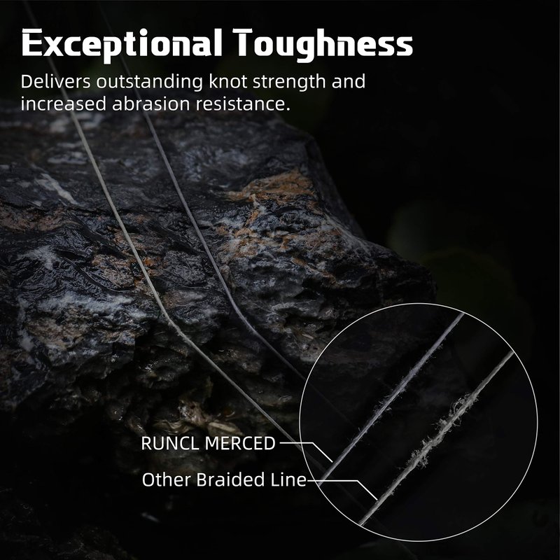 - Proprietary Weaving Tech: Engineered with a proprietary treatment process, RUNCL MERCED Braided Line produces a rounder and more consistent structure (a higher weave per inch count) that compacts very well and stacks evenly on to the spool for increased operation, helps reduce backlashes, wind knots, and rod tip wrapping.