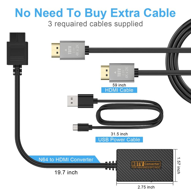 - š®ćEnhance Your Gaming ExperiencećThis product includes a N64 HDMI adapter converter, HDMI cable, and USB cable to bring your old-school games into the modern gaming world. Note: Depending on the TV device, this HDMI cable cannot increase the screen resolution.