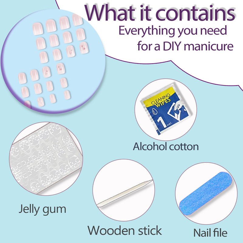 • 💖【Short false nails Package】- 24pcs/12 sizes short nails, 1 nail file, 24pcs jelly glue. (Durability of jelly glue is not as good as liquid glue, but it makes fake nails reusable,Please use suitable glue according to different scenes).