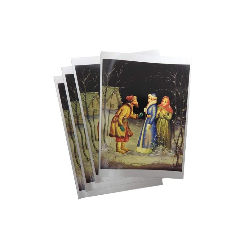 In this age of instant communication, writing and sending a Christmas card is still an authentic, personal and meaningful gesture. If you like to receive a card, then you surely like sending them. It's unique. When you send out a card, you are sharing a valuable emotion. Each of our full-color 5"x7" cards reproduce in gorgeous detail a Russian miniature painting. The quality is so fine that you may as well be purchasing an art print. Many of our customers have told us that they like to frame our cards. "Happy Holidays" is pre-printed inside each card. Envelopes are included.