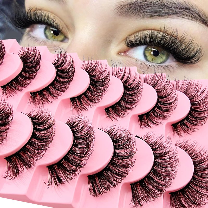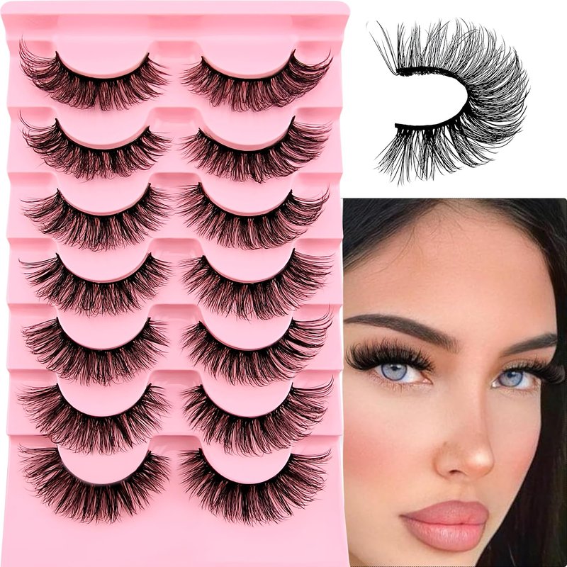 Russian Strip D Curl Lashes Flu-ffy 17mm Fake Faux Mink Lashes that Look Like Extensions Curly Volume Cat-Eye Lashes, Wispy Eyelashes 7 Pairs Pack(7P-E14)