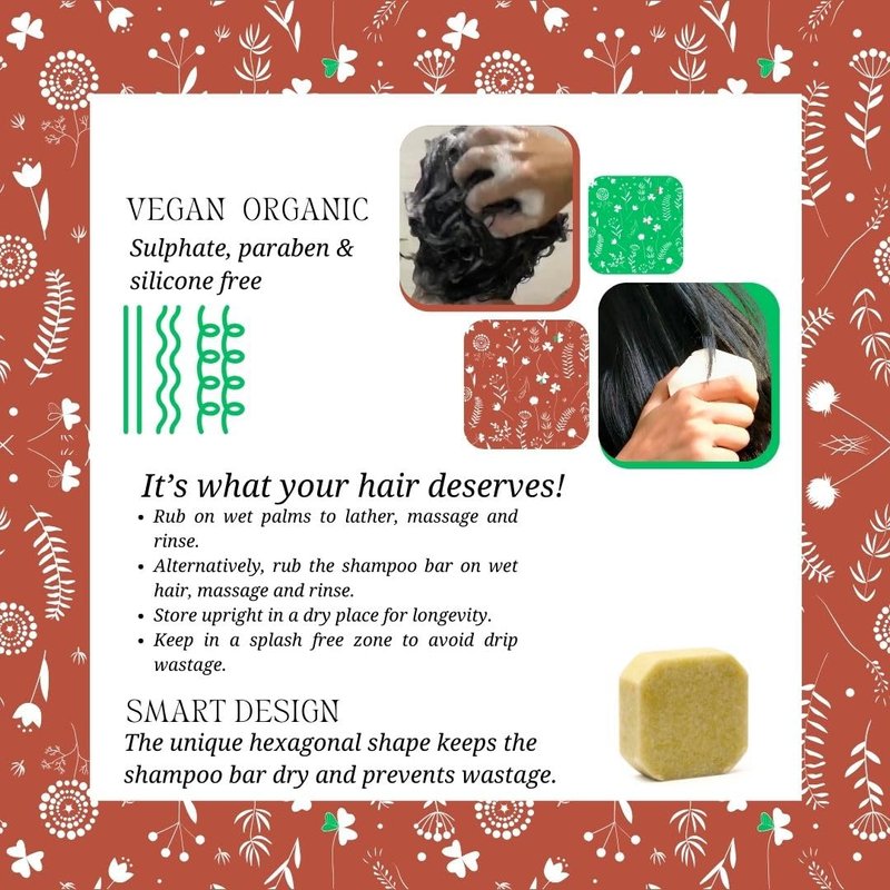 - Sustainable & Gentle: This 100% soap-free, vegan bar is biodegradable and free of harsh chemicals like sulfates, parabens, and silicones.The bar contains no synthetic colours or fragrances. It is pH balanced for hair wash. It can be used post oil massage. Suitable for all hair types. Water efficient: requires less water to rinse off, does not add toxins to rinsed off water. One hair cleansing bar replaces at least 3 shampoo bottles.