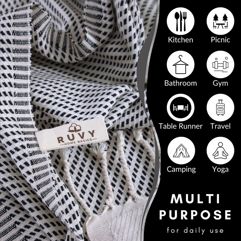 RUVY HOME BASICS HAND TOWEL SET Ruvy Home Basic hand towels are 100% cotton and multi-purpose towels. Both kitchen decor and kitchen towel, or towel for bathroom. Also a housewarming gift for your loved ones. Areas of use are quite wide; Kitchen towel Bathroom towel Gym towel Spa towel Picnic towel Yoga towel Moreover, highly suited to creative collaboration. With kitchen decor, kitchen towels, hand towels, and table linens, or quick-drying towels in your kitchen, you can use it like a dishtowel; It is suitable for use as a bath hand towel, face towel, and bathroom decor in your bathroom, as a decorative cover and tablecloth in every corner of your home. You can use it as a gym towel or guest towel as you use it as a beach towel set and create an oriental atmosphere in your home. Ruvy Home Basics Turkish Towels are quick-drying towels as they are 100% cotton towels. For this reason, you can make things easier by using them as dishcloths for the kitchen, as large bath hand towels, as spa towels, or as beach towels. Care Instruction Machine wash 90°F |30°C| Do not use bleach or softener Thumble dry is not recommended, air dry is the best White distilled vinegar will make fluffier Warm iron can be used to smooth our unwanted wrinkles