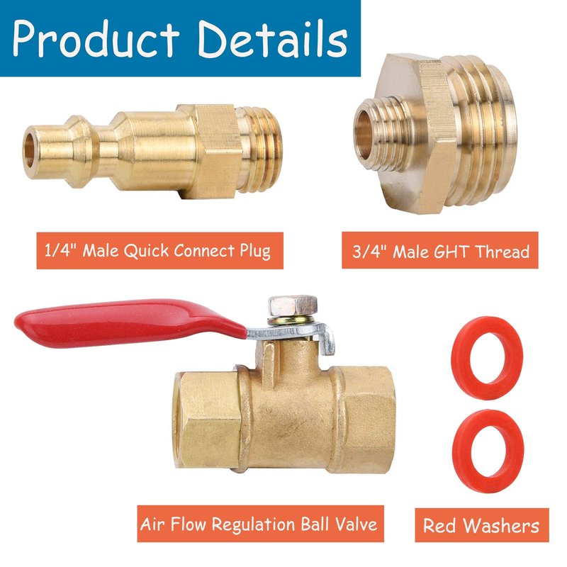 - ▼ Package including - 1 × Winterize Blowout Adapter with Ball Valve, 1 × 1/4" Male Quick Connect Plug, 1 × 3/4" Male GHT Thread and 2 × Red Washers