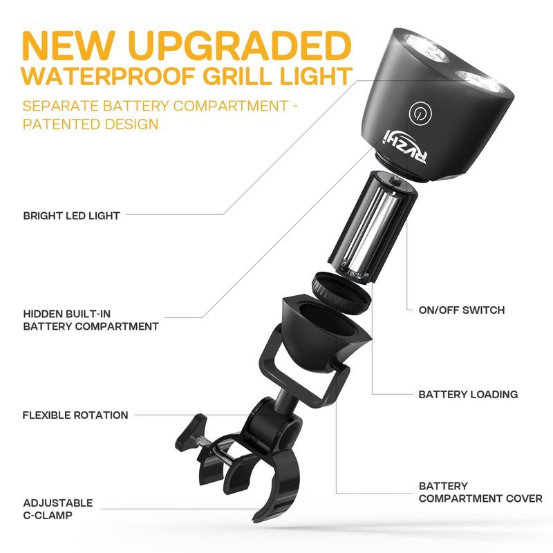 - EXCLUSIVE PATENTED WATERPROOF DESIGN: Ensure that your grilling fun is not hampered by the rain. The 2023 upgraded BBQ light comes with individually sealed double-protected battery compartments to avoid water vapor, and up to IP65 waterproof rating. No matter if it's windy or rainy, the RVZHI grill light will be your trusted BBQ accessories.