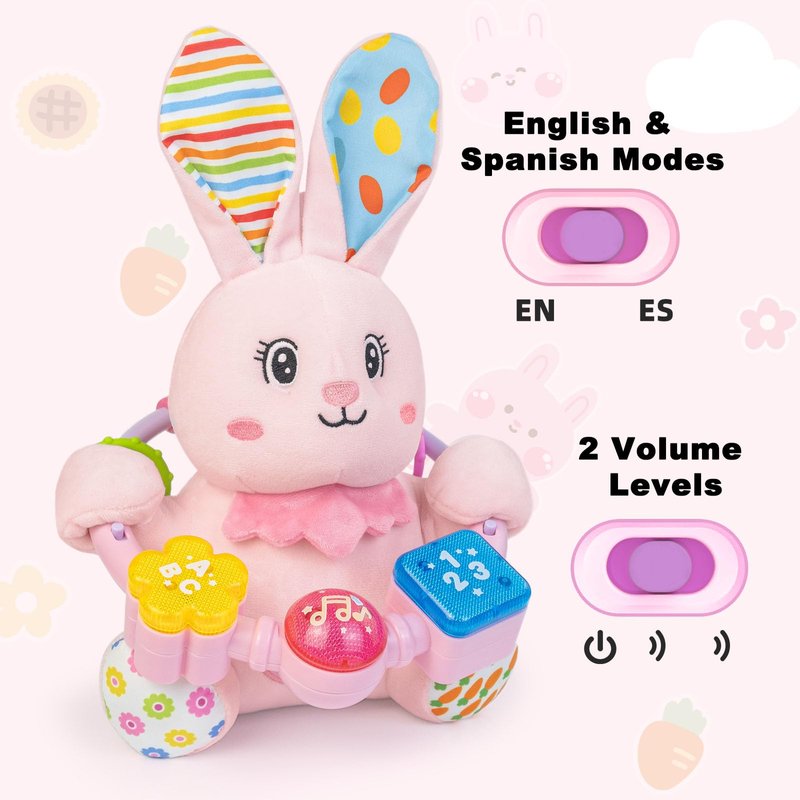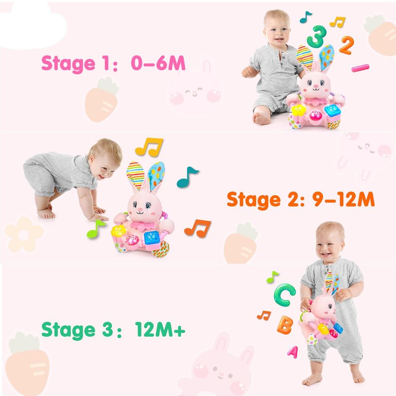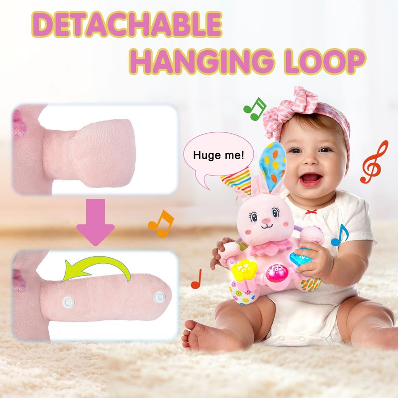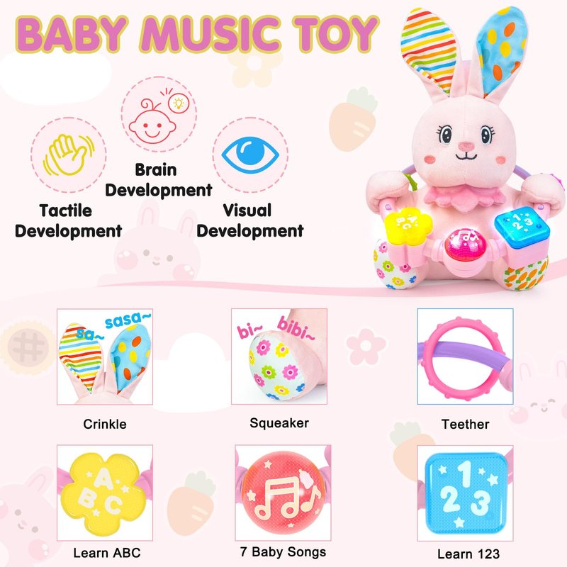 - BABY MUSICAL TOYS: The cute bunny baby toy features three buttons, each with different music effects, including numbers 123, letters ABC,and 7 soothing baby songs. Pressing each button activates different sounds and lights, capturing the baby's curiosity and attention while helping to soothe them to sleep. Designed for babies aged 0-6-12 months, it enriches their sensory experience.Promote gross motor and tactile skills