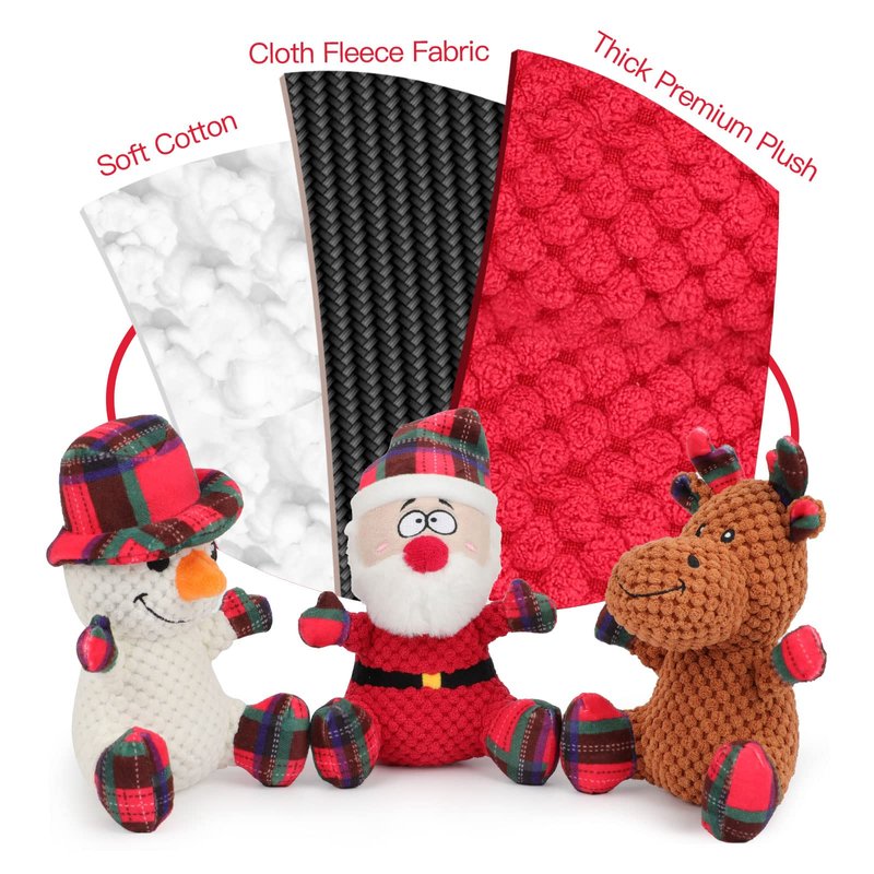 Santa, Reindeer, Snowman squeaky toys for dogs are made of soft, non-toxic PP cotton and thick corduroy core, which is quite suitable for dog dental cleaning.Double suture process make your dog toy more durable! Machine washable.