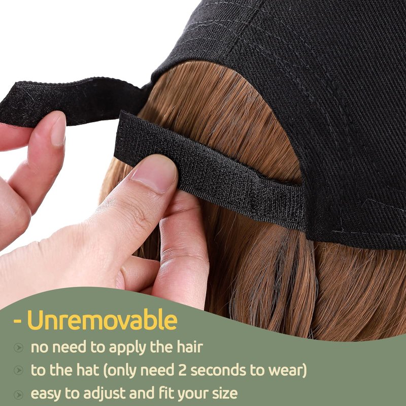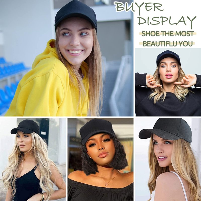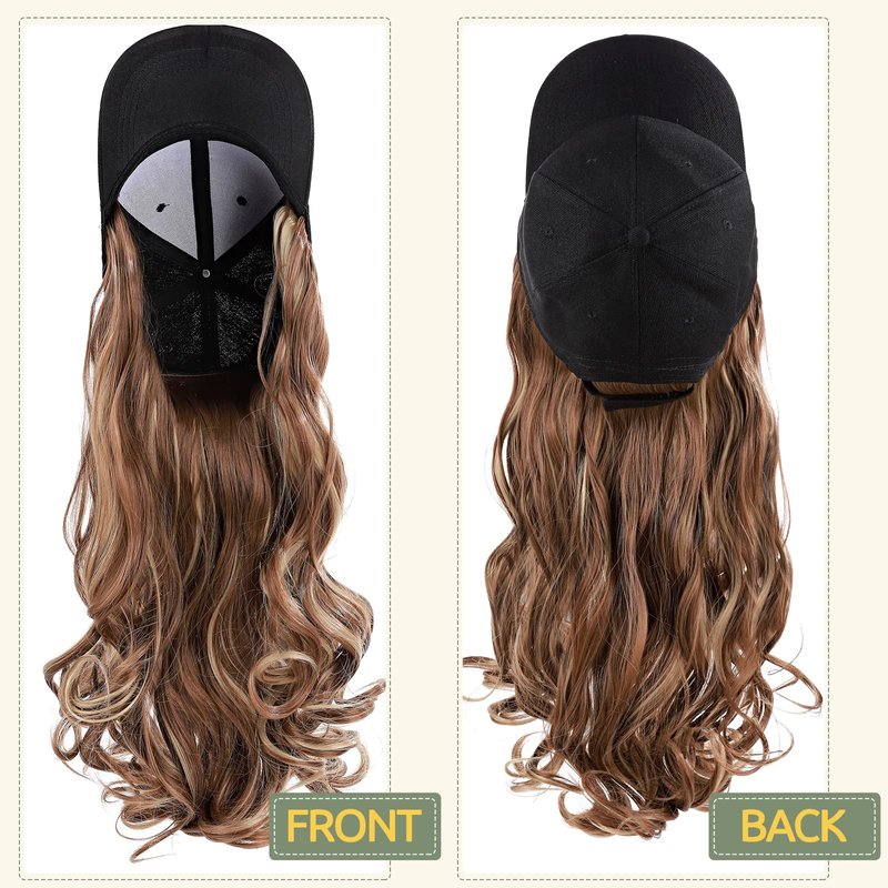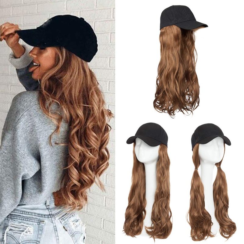 Product Features Item type: Baseball Cap With Hair Styles: Long Wavy / Corn Wave Hair Extension Hair Type: Cosplay Hair/Patient Hat Hairpiece/Cap Hair Extension for Women Hair Color: Black / Brown / Blonde / Ombre, 7 color available Material: Heat Resistant Synthetic Fiber Wig Length: 16”-Curly, 18”-Corn Wave Weight: About 320g Items/package: Cap With Hair as whole Hat Detail The Color is the hat is black, The diameter of the cap is about 6.5 Inches (minimum condition,can be adjusted), Brim Width: 3 Inches, The height of cap: 5 Inches How to wear the hair extension? 1 Comb your hair in a natural condition or you also could make a low ponytail; 2 Put on the cap and adjust the velcro tape to fit your size; 3 Blend the extension with your hair well 4 Make a ponytail or braid it as you like 5 finish