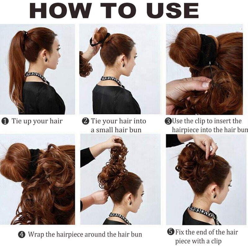 This synthetic fiber hair bun extension creates an elegant chignon or ponytail accent that can be worn for a prom, wedding, or evening out. Use the elastic Hair band tie around your hair for a secure fit. Our hair wraps will transform your look in seconds. It's that easy! Just like your own hair, synthetic hair will accumulate residue through normal wear. The fiber should be washed as infrequently as possible or when you notice that the fiber appears dull. You can wash them after 4-6 wears. Before shampooing, gently remove any tangles or teasing with your fingers or a pick comb. Pick the hair from the ends and work your way up.