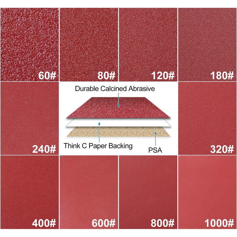 - Long Lasting to save money: The self stick sandpaper made from premium aluminum oxide grain is a C-weight paper with resistance and anti-static. PSA self stick makes grit changes quick and easily, and lengthens the life of the abrasive. Pre-punched with No-holes for uniform dust extraction.