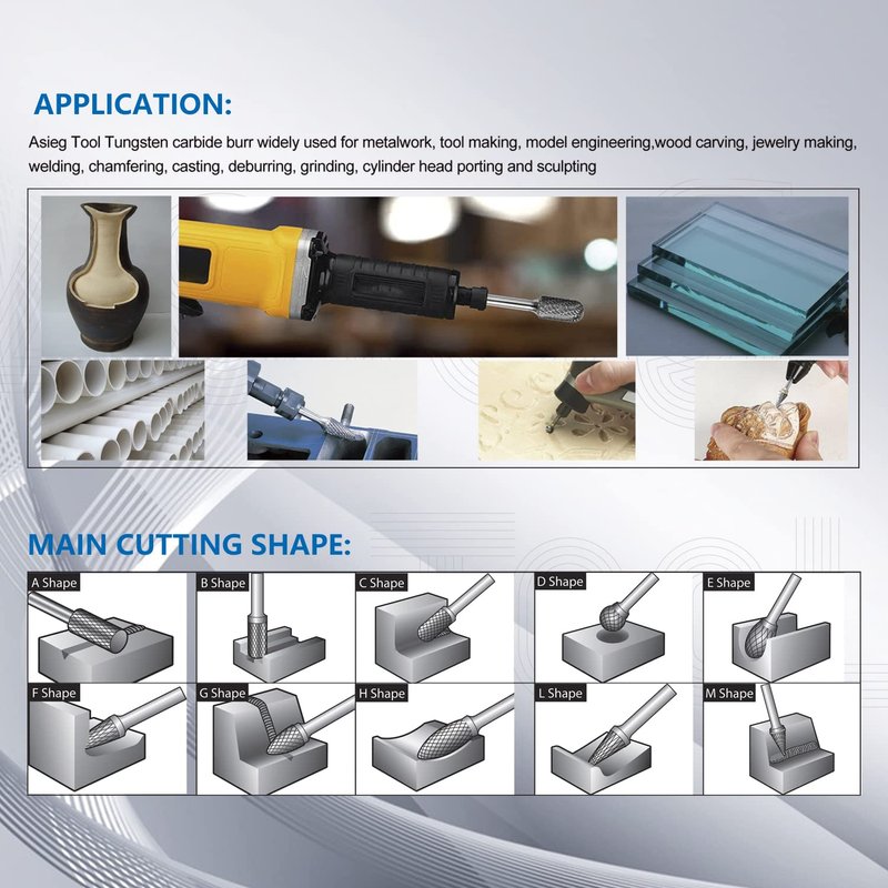• Carbide Rotary Burrs Bits widely used in machining iron,steel casting,carbon steel,alloy steel,stainless steel,hardened steel,copper aluminium etc.