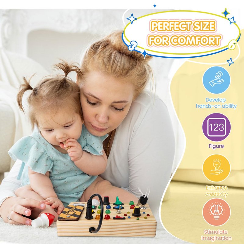 - Educational and Entertaining: This Montessori-inspired busy board is an ideal gift for birthdays, Christmas, and other celebrations. It helps toddlers learn color and size differentiation while developing tactile and cognitive skills, making it a perfect alternative to screen time