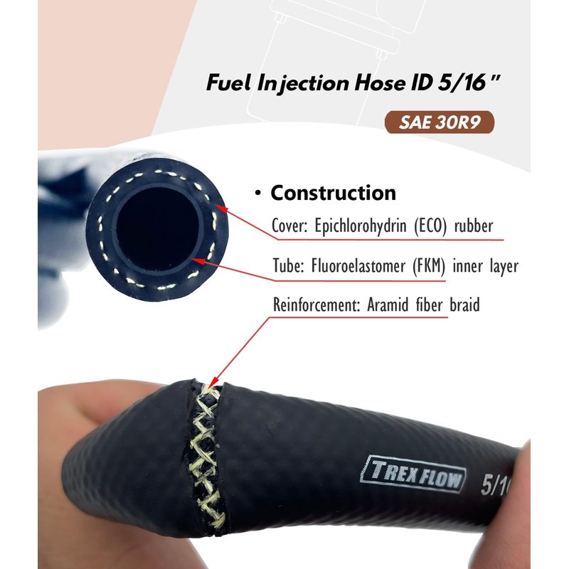 • [Feature:] Fuel injection hose 5/16 with inner Fluoroelasomer layer (FKM); Applicable with Gasoline, E85+, racing fuels, methanol, diesel, biodiesel B5, B10,B20, Lubrication oil, etc.