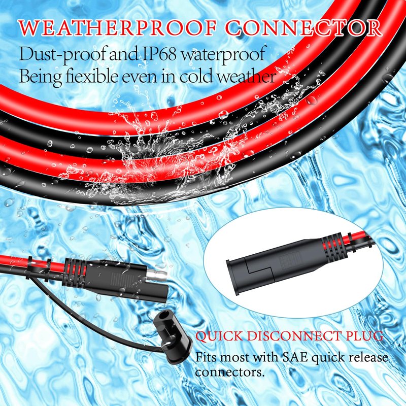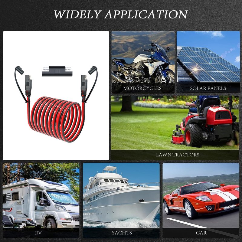 - [Wide Application]: For expansion of most batteries and chargers with SAE quick release connectors. Widely used in a variety of batteries, solar panels, motorcycles, lawn mowers, ATV, RV, traction motors, tractors and other equipment that requires SAE plugs. Enhance your power solutions with the SAE to SAE Extension Cable. Whether you're in the garage, at the campsite, or harnessing solar energy, giving you the freedom to tackle your projects with ease.