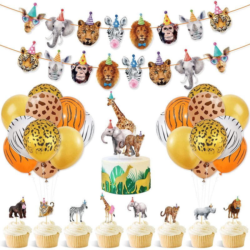 - SAFARI PARTY DECORATIONS SET: The package includes 2 sets of safari animals banners with party hats decor, 1pc party animal cake topper, 24pcs animals cupcake toppers in 8 patterns, and 30pcs 12in latex balloons. It contains almost everything you'll need for a wild animal themed party.