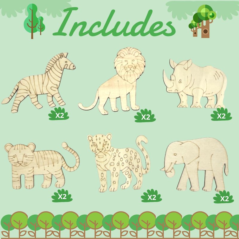 - 𝟏𝟐 𝐏𝐚𝐜𝐤 𝐊𝐢𝐝𝐬 𝐒𝐚𝐟𝐚𝐫𝐢-𝐭𝐡𝐞𝐦𝐞𝐝 𝐏𝐚𝐫𝐭𝐲 𝐒𝐮𝐩𝐩𝐥𝐢𝐞𝐬: This Safari Craft Kit includes 12 wooden animal cutouts like an elephant, lion, rhino, and more, 12 safari theme cards, 12 mini watercolor paints, 12 brushes, 12 bubble wands and 14 pcs clear bags. Perfect for kids to explore their artistic side and learn about wildlife.