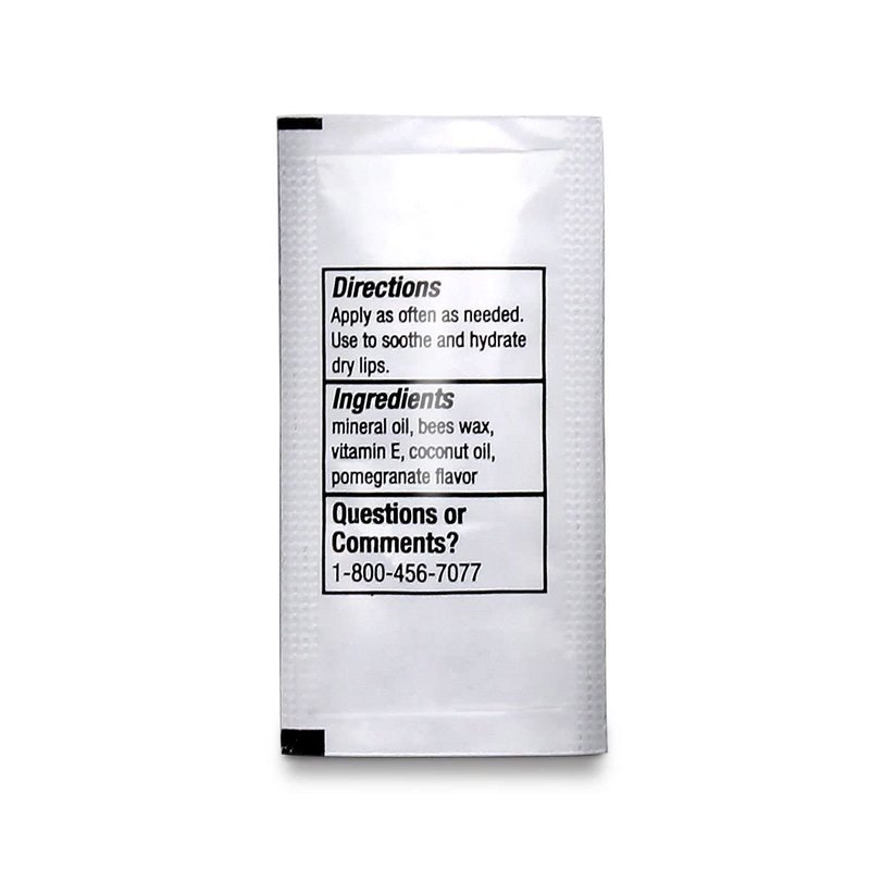 • Pomegranate flavored Lip Balm in 144 convenient foil packets.