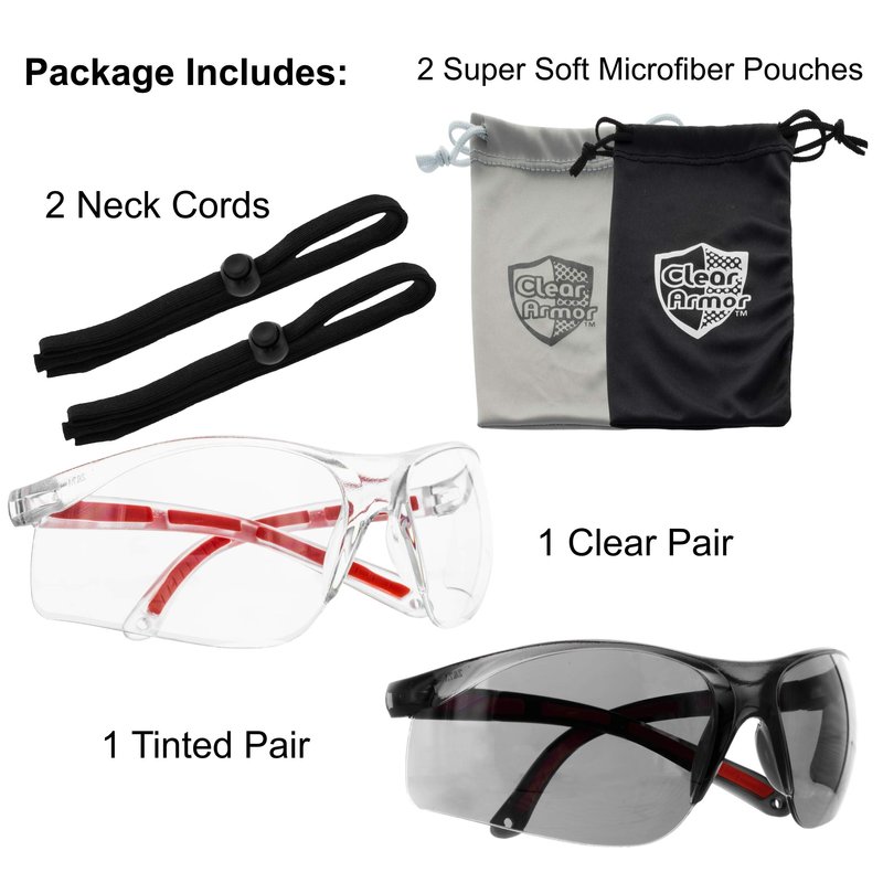 - Includes 2 Pairs of Safety Glasses (1 Clear, 1 Tinted) - 2 Premium Neck Cords - 2 Microfiber Pouches