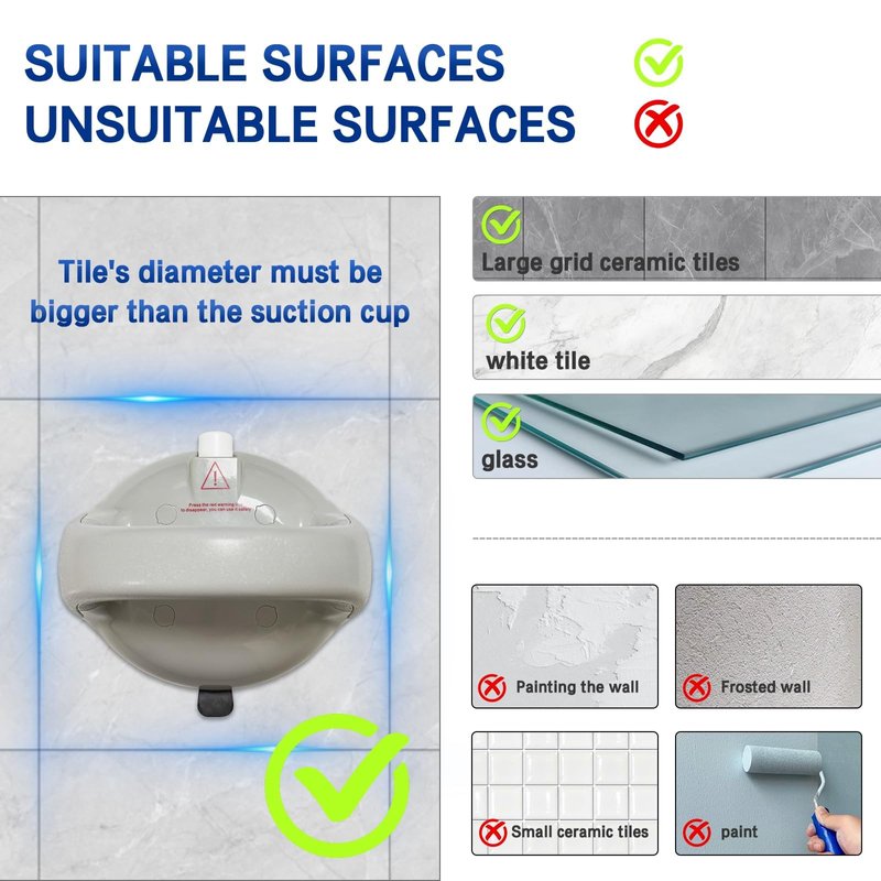 - 【 Important Note 2: Smooth and Non-porous Flat 】 The shower grab bars for seniors only suitable for smooth and non-porous flat, like tile, marble, glass, wardrobe, metal surfaces. Uneven or textured surfaces will cause the suction cups to not hold securely. And you must be to clean the water-stained walls before using.