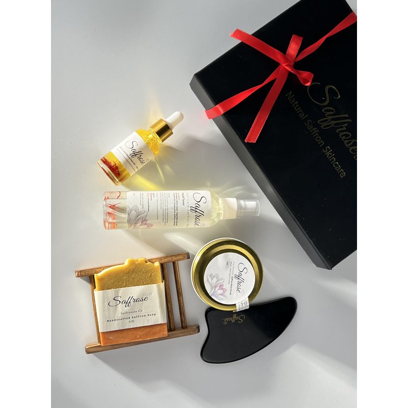 SaffroseLA Handmade Saffron Skincare Gift Set, 5pc including Saffron Soap, Bamboo Soap Dish, Saffron Scrub, Saffron & Rose Facial Toner, Facial Oil, & Gua Sha