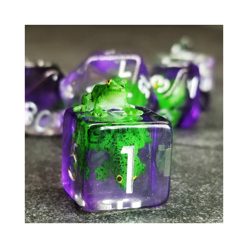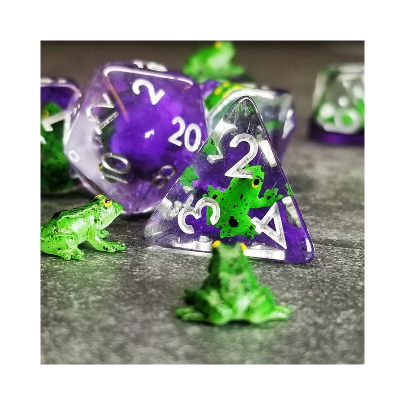 - Maximum Cuteness: Sage’s Green Frog Familiar Dice Set transparent/purple with green frog inclusion with and white ink.