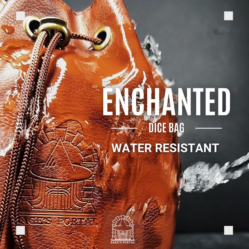 Sage’s Enchanted Dice Bag! Carry your dice collection in proper style with Sage’s Enchanted Dice Bag! This dice bag is made from high quality chestnut/walnut spotted textured PU leather giving a stylish and classic look. The sturdy cord is adorned with 2 acrylic D20 cord ends and the bag features high quality metal cord locks and cord holes. The outside material is rugged and is lined with black velvet-like material, with inner pocket dividers to keep your dice organized.