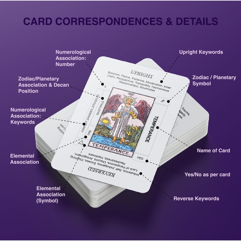- ✨How To Use Tarot Cards: Shuffle the cards with intent, infusing them with the energy of your inquiry, draw one or multiple cards, trust your intuition to guide your choice, and explore the meanings of your chosen cards by reading from the cards. Cards include numerological associations, zodiac, planetary association, and decan position; as well as elemental and yes/no descriptions on every card.