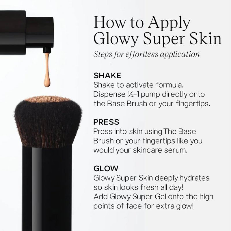 - START with a fresh canvas of clean, prepped skin. SHAKE to activate [Glowy Super Skin Tint Foundation]. Separation is normal due to 85% skincare ingredients. WARM 1 pump onto fingertips or PUMP directly onto The Base Brush. PRESS into skin like you would a hydrating serum until fully blended. SET where needed with Airset using The Fluffy Brush. ENJOY that Signature SaieGlow™.