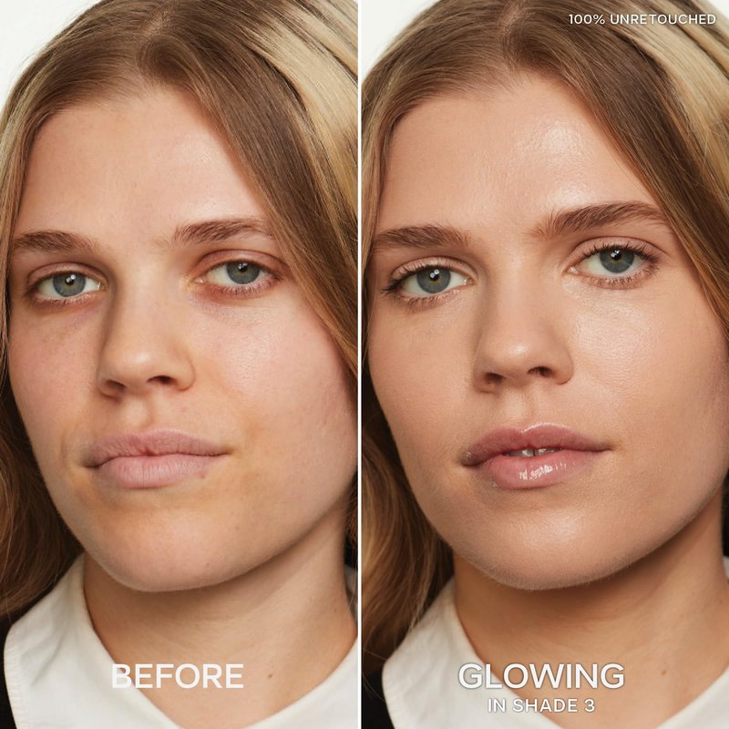- Prep skin with Glowy Super Gel and/or Slip Tint Tinted Moisturizer for sheer coverage. Using doe-foot, dot on Slip Tint under eye concealer to conceal blemishes, redness, dark circles or anywhere else you want medium coverage. Tap and blend out using the small end of The Double Brush.