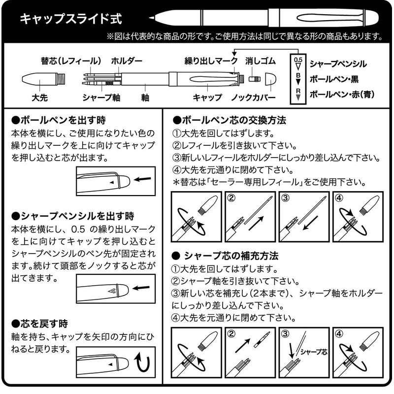 - Mechanical pen: Cap slide / Ballpoint pen: Sliding 3 colors