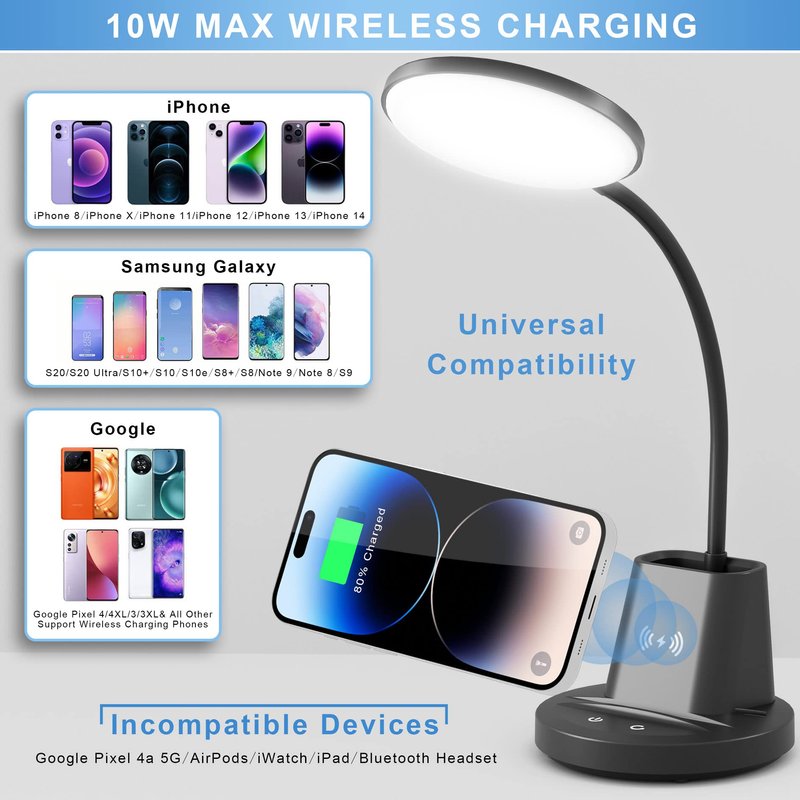 - Desk Lamp with Wireless Charger: LED desk lamp with a built-in wireless phone charger and pen holder. This office desk lamp is compatible with iPhones, Samsung, and most devices that support fast-charges smartphone at 10W. You will love this feature to help you to watch movies while charging your phone. The small desk lamp also comes with a 1.8m power adapter, so you don't need to buy adapters separately. A 5V/3A power adapter delivers optimum charging and stable lighting. (Adapter Included)