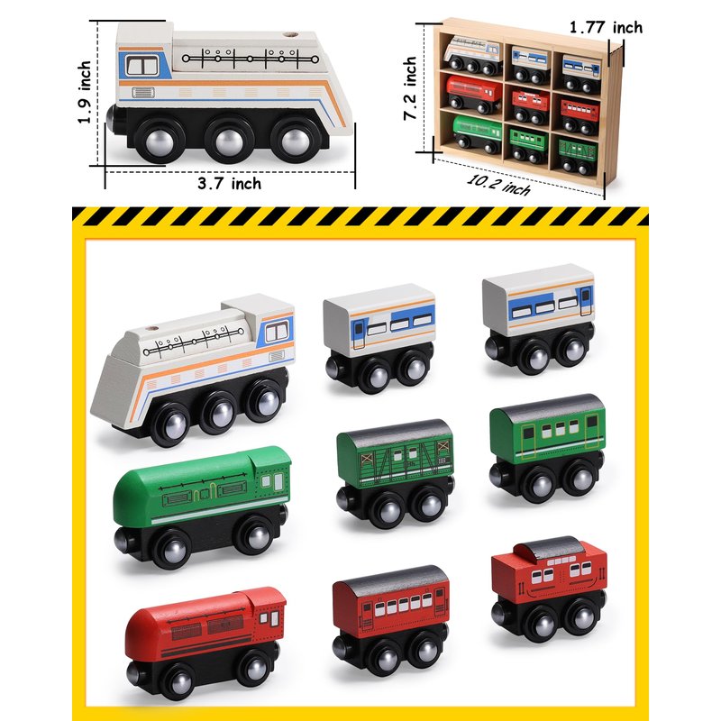 Wooden Train Cars Comes with 9 pieces train cars, compatible with themselves and other wooden track systems.