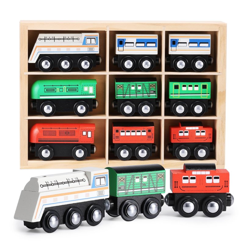 SainSmart Jr. 9 Pcs Wooden Train Set Magnetic Train Toys for Toddlers Kids Engine Vehicles Toy Train Cars for Boys Girls Compatible with Train Tracks
