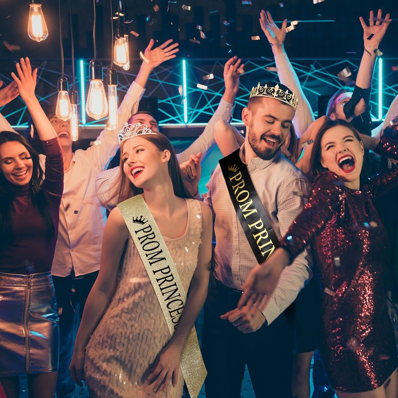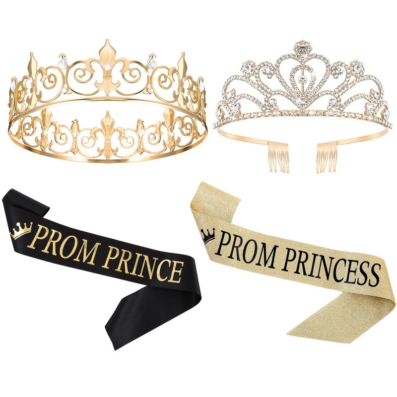 - What You Will Obtain: our package includes prince prom crown and princess prom crown set, prom sashes in black and gold, totally 4 pieces, you can wear them with your friends together, enough quantity will meet your needs