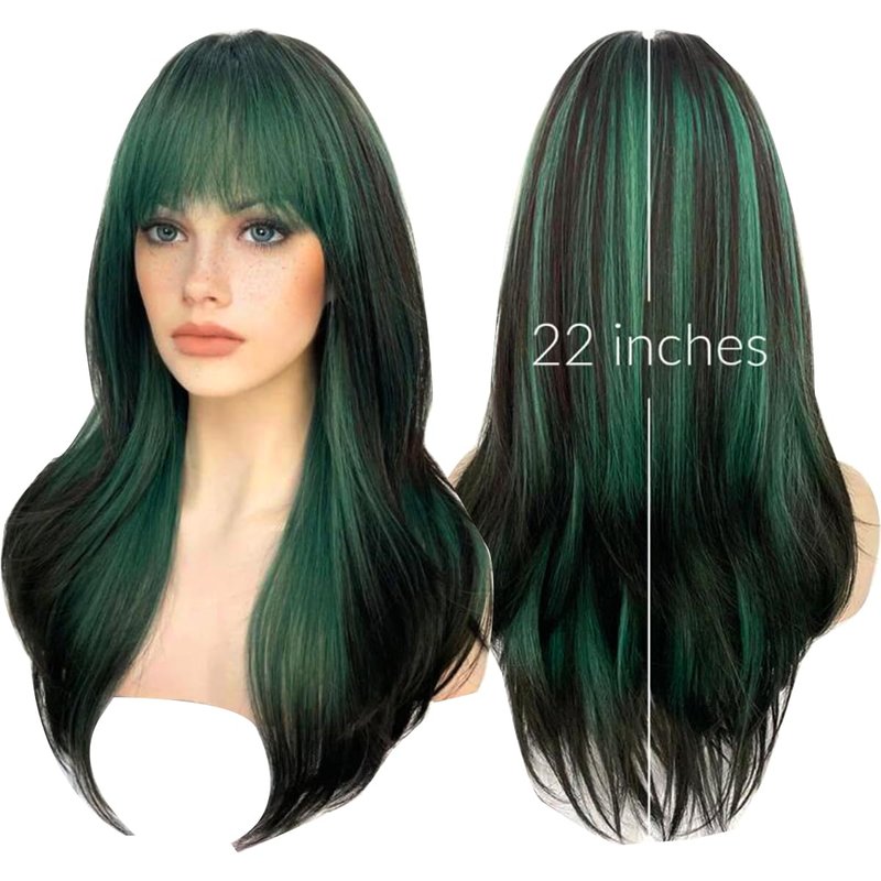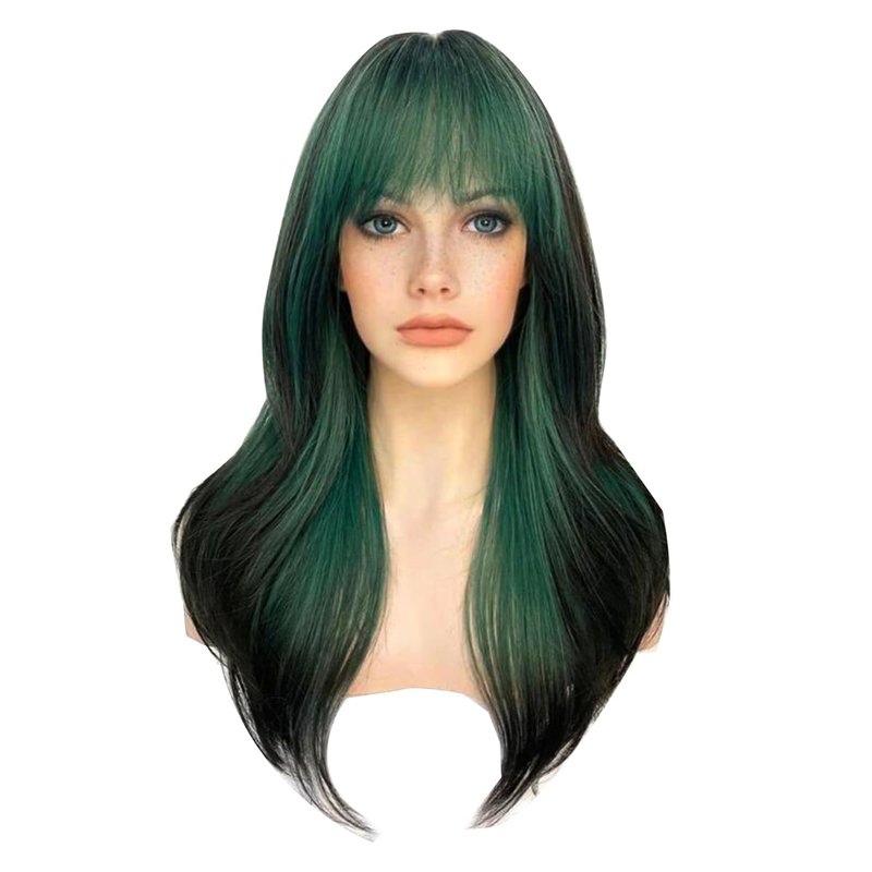 Sallcks Womens Green Wig Long Layered Green with Black Highlight Wigs with Bangs Heat Resistant Synthetic Fiber Wigs