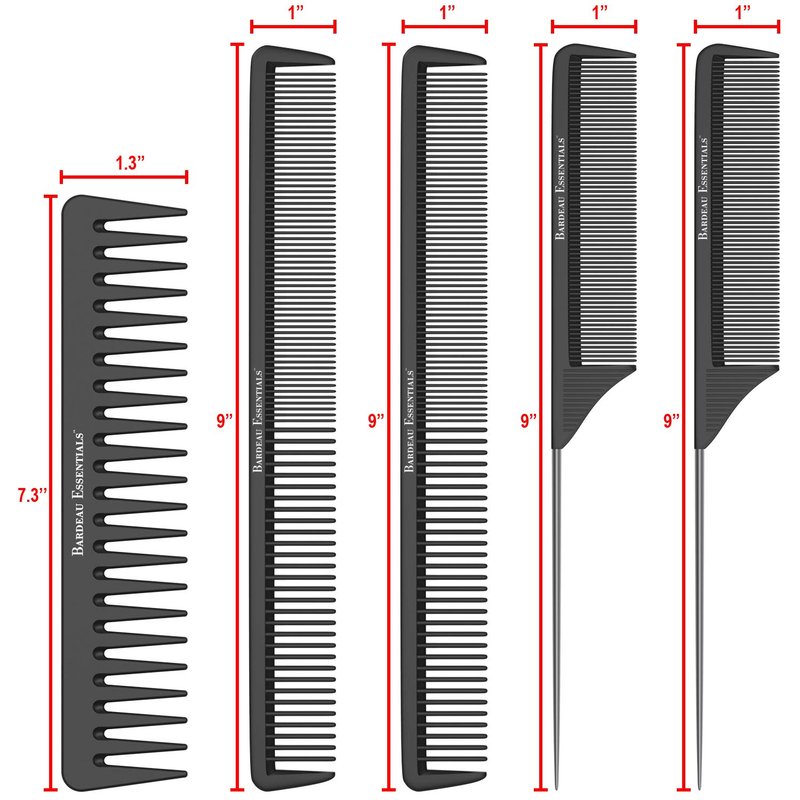 Salon Styling Combs | 5 Piece | Professional Black Carbon Fiber Hair Combs | Detangling Comb | Rat Tail Comb | Teasing Comb | Salon Grade Combo Comb Set for Men and Women by Bardeau Essentials