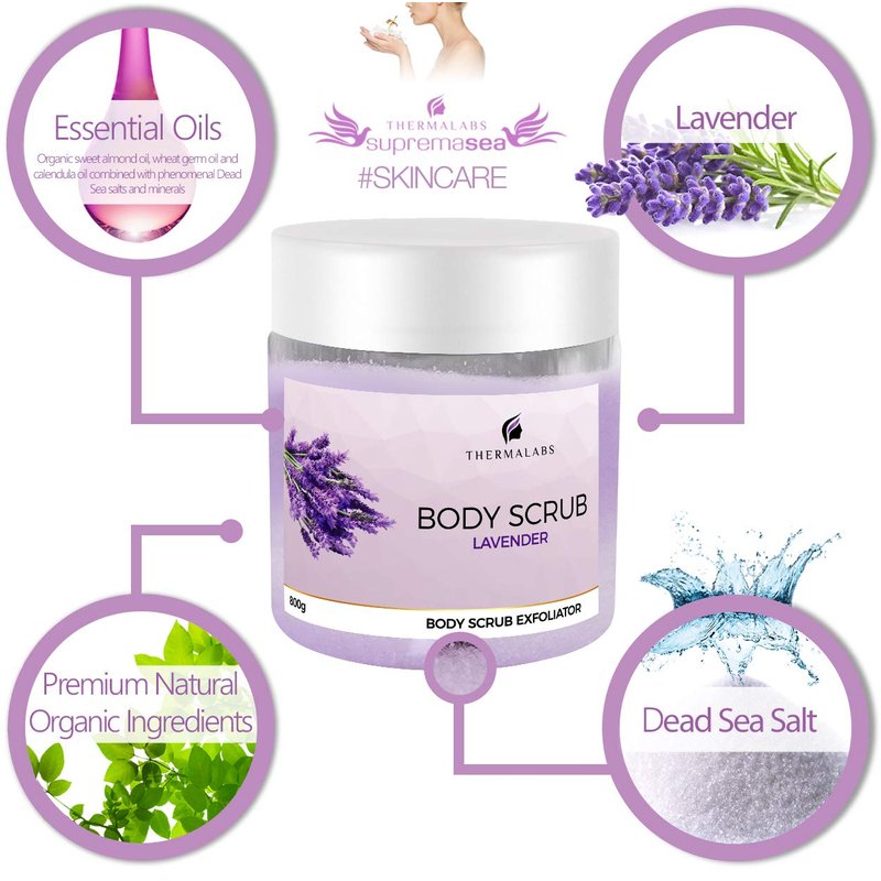 • MAKE CHAPPED, DRY SKIN A THING OF THE PAST! Your body will thank you, and your friends and family will swear you look younger after using Thermalabs lavender scrub exfoliator. Our exfoliator treats dry skin like magic thanks to its organic all natural essential oils, like sweet almond oil, wheat germ oil and calendula oil, combined with Dead Sea salts and minerals that provides gently, yet powerful exfoliation and restores moisture
