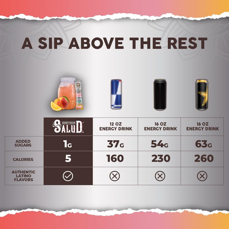 - US vs THEM - Unlike traditional energy drinks loaded with sugars, Salud will turn plain water into a mouth-watering Agua Fresca drink with only 1g of added sugar and 5 calories per serving. You can feel good about starting your mornings and workouts with Salud!