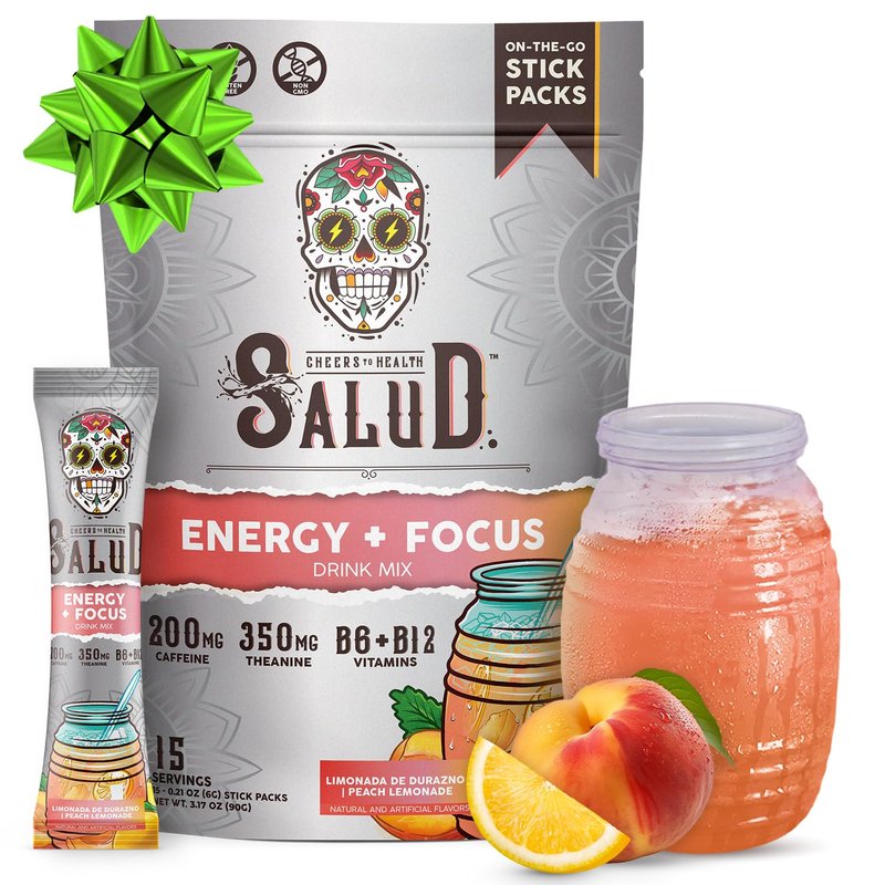 Salud 2-in-1 Energy Drink Powder + Focus, Peach Lemonade, Organic Caffeine, B6 + B12, Theanine, Clean Energy Drink Packets, Agua Fresca Mix, Non-GMO, Gluten Free, Vegan, 1g of Sugar, (15 Servings)